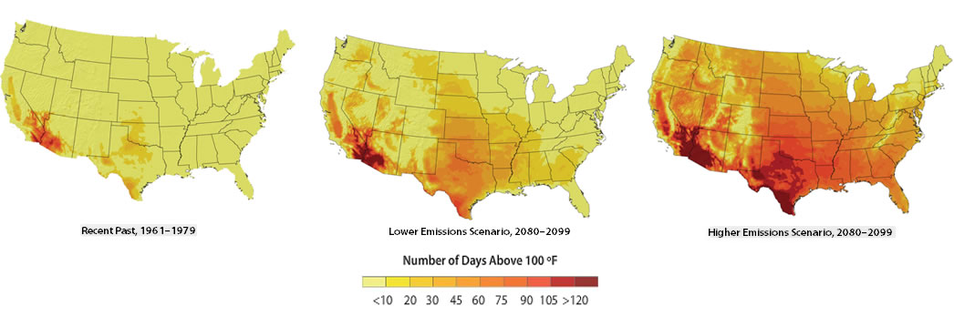 A warming climate inevitably results in more warm days. As greenhouse gas concentrations rise, the number of cold days and nights are expected to decrease, while hot days are expected to become warmer and more frequent. Below are projections of the number of hot days (above 100°F or 38°C) that the United States may experience from 2080-2099 under low emission and high emission scenarios.