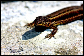 Conduction: The transfer of energy through direct contact and collisions between neighboring molecules. The lizard pictured above feels heat energy transferring directly from the warm rock to his underbelly, increasing the average kinetic energy of the particles that make up his body.