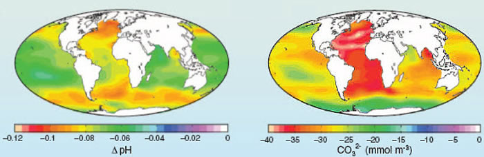 Right: Image shows the estimated change in annual mean sea surface carbonate ion concentration between the pre-industrial period and the 1990s.